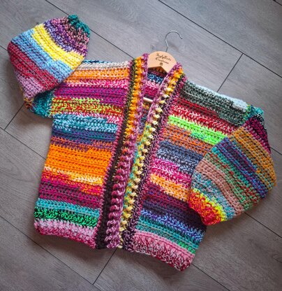 The Kids Scrappers Delight Cardy is a beginner friendly pattern and uses 2 strand of yarn through with a 6.5mm hook.