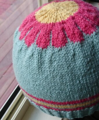 The design is worked seamlessly from crown to band in the round using three or more colours. Choose your own daisy colours to brighten any blustery day.