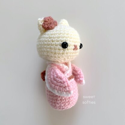 The Kimono Kitty Doll is a little cat who wears a traditional Japanese dress. This sweet amigurumi’s outfit includes a kimono with the oversized sleeves and a bow on the back. She also wears a sakura (cherry blossom) flower on her head. This kokeshi pattern is easy to customize with different yarn color combinations. The Kimono Kitty makes for a perfect handmade gift!