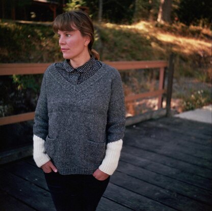 Kinsac is worked flat and seamed, and incorporates two colours of Hinterland Range for insartia detailing on the sleeve cuffs. The flattering, gently-sloped v-neck is picked up and worked after seaming, and looks equally polished with or without a collared shirt below.