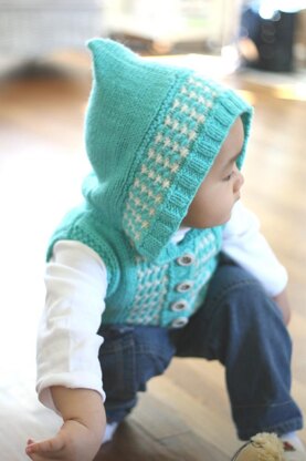 *A comfortable gender neutral baby hooded vest with a star tweed stitch edge. The body is worked in one piece mostly in plain Stockinette stitch and knits up quickly. The star tweed stitch will be worked in the end as a part of front/hood edging. Buttons are attached for fro