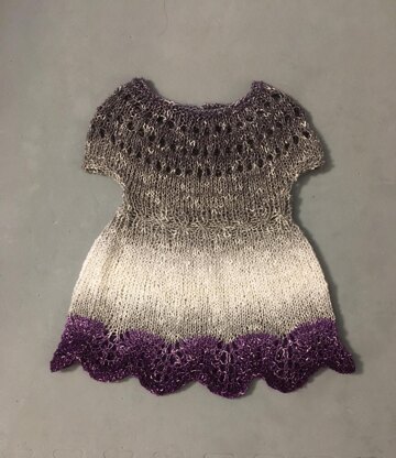 Pattern notes: The dress is knit top down and all in one piece Starting at the collar, and knitting flat for the first 25 rows, the yoke of the dress is then joined for in the round. The sleeves are bound off shortly thereafter and the bodice is continued in the round with a few rows of ribbing and cables to create a waistline. The skirt is also knit in the round after a couple rows of increases to create an A line shape. The bottom hem is then knit with a feather and fan lace pattern to create a nicely scalloped edge. Button is added to back for closure.