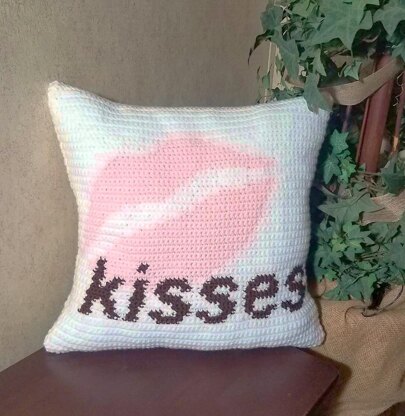 (1) crochet pattern for a Kisses Pillow. Made with really soft “I Love This Yarn” brand yarn, this pillow was created in conjunction with the Hugs Pillow for Valentines Day. The "lipstick" print in the background and chocolatey lettering make this simply SWEEET for your favorite Valentine...or in a little girls room!