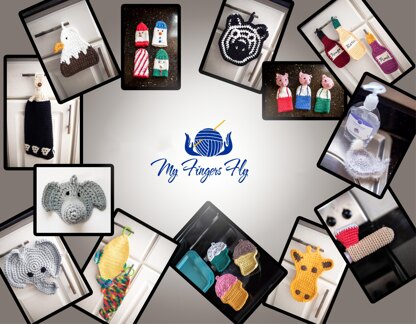 * Zebra potholder * Wine Bottle potholders * Three Little Pigs panhandlers * Bunny dish scrubby * Firefighter axe panhandler * Giraffe potholder * Ice Cream Cone potholders * Fish kitchen towel * Elephant potholder and panhandler * Skull kitchen towel * Bald eagle potholder * Christmas panhandlers - elf, peppermint, snowman, and Santa