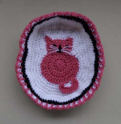 Super adorable and fun to make, this oval shaped Kitty Basket Crochet Pattern is worked in stunning pink, black and white – or choose your own colors! Makes a great gift, especially for the cat lover in your life, as well as for children and teens. Make one for yourself and several for friends. Perfect for Mothers’ Day and Birthdays, Christams, Hanukkah, or maybe even a unique Easter Basket. This distinctive table décor will be a conversation piece while holding silverware, serving pieces or napkins, or use to hold odds and ends in any room. Measures about 8.5” in length, 6.5” across and 2.25” tall.