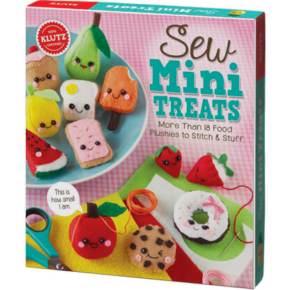 Klutz-Sew Mini Treats Book Kit. Make your own felt food with fabulous faces! This package contains one book with over eighteen designs, three paper pattern pages, twelve sheets of acrylic felt, 32 yards of cotton floss in eight colors, thirty precut acrylic felt eyes and cheeks, two embroidery needles and 1oz of polyfill stuffing. Softcover, 48 pages. Published Year: 2016. ISBN 978-0- 545-90652-4. Imported.