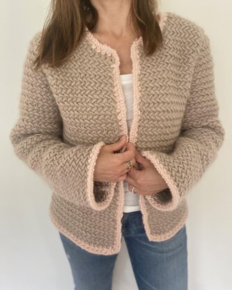 The herringbone stitch pattern gives a nice and structured texture to give the jacket some shape and hold. Oh, and its super fun to knit too!!!