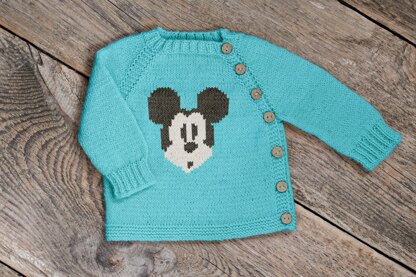 This beginner-friendly pattern helps you create a cozy, top-down baby sweater with cute Mickey Mouse embroidered on the front. The cardigan is worked in one piece from the neckline down, with raglan shaping and a charming asymmetrical front closure along the left raglan line. The pattern includes row-by-row written instructions, making it perfect for beginners or knitters who want step-by-step guidance. You’ll begin with neckline shaping using short rows, continue with raglan increases, work the sleeves flat, and then finish the body. Decorate the smooth stockinette with color Disney character motif embroidery using duplicate stitch colorwork.