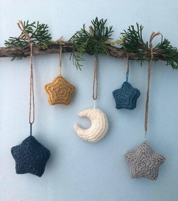 Merry Christmas!!! This PDF pattern will instruct you on how to knit my original 2020 Christmas Ornaments. Pattern includes instructions for the following knit ornaments: Large Star, Small Star and Moon Measurements are not including the Loops for hanging: Large Star: 3.5 inches tall, 3.5 inches wide Small Star: 2.5 inches tall, 2.5 inches wide Moon: 3 inches tall, 3 inches wide Materials: DK or Light Worsted yarn: Dark Blue, Light Blue, Grey, Yellow, and Cream Poly-fill stuffing Pair of size 3 (U.S.) knitting needles (3.25 mm) Yarn Needle Techniques: Knit and Purl Stitch Casting on and casting off Knit 2 stitches together Knit in the front and the back of that stitch (increase)