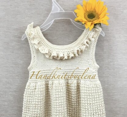 This adorable little dress is made in a soft and light cotton yarn, great for sunny summer days! It can also be worn with a T-shirt on colder days!:) Knitted Measurements: Chest: 21.25” (22.5”)/ 54 (57)cm Length (measured from shoulder): 17” (18.5”) / 43 (47) cm