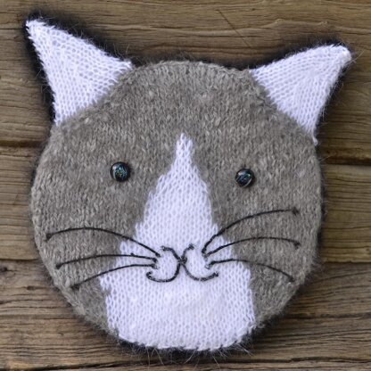 Knit Your Cat Pillow is designed for you to be able to pick yarns and colors similar to your cat and use those yarns to add personalizations to the pillow front. One of my test knitters, made a nice memorial pillow for a cat that recently passed away. I suggest having a high quality photograph handy if you wish to embroider unique facial markings. Shown in DK weight angora (cost was about $65 but I had enough yarn for 2 pillows). For a cheaper yarn that is still fuzzy, I stranded sock weight wool with lace weight mohair. Pillow is worked in 7 pieces (front, back, 2 front ears, 2 back ears, and edging) and sewn together at the end. The angora and mohair yarns are very forgiving to cover the finishing threads. Pillow size is approximately 10 by 10 inches. To save a few dollars, I used stranded silk sock yarn for the back, saving the angora for the front and edging.