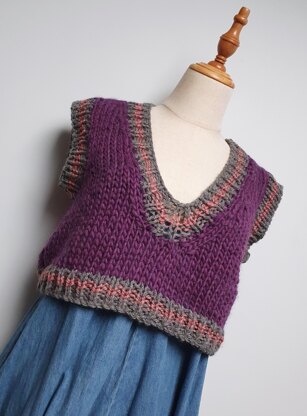 This beginner-friendly knitting pattern creates a versatile super chunky crop V-neck tank, perfect for layering. The tank is worked flat in two separate pieces, front and back, making it a straight-forward project for those comfortable with basic shaping. Once the main body is complete, stitches are picked up to add ribbed trims at the neckline and armholes. Designed to work well in a single colour or with contrast details, this pattern offers flexibility to customise your look (the instructions will create the colours as per the image).