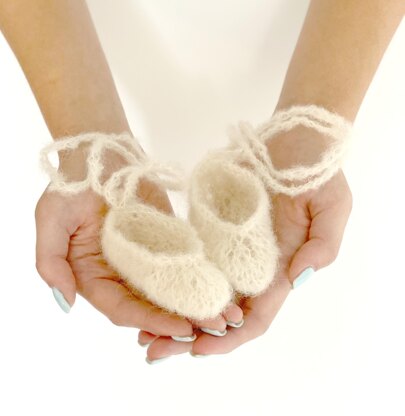 This beautiful and delicate ballerina shoes is made from delicate mohair and is intended to be used as a photography prop. The slippers are worked flat and the sole is sewn on. A simple single crochet stitch is used for the ties.