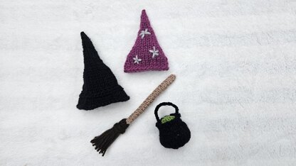 This pattern shows two knitted hat designs, made from one or two knitted hat pieces, a knitted cauldron piece with a knitted potion topping piece and finger-knitted handle, and a knitted broomstick piece with a looped and sewn broomhead. All pieces are sewn individually.