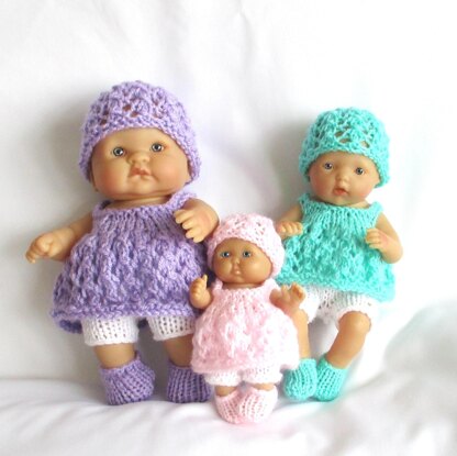 Knitting pattern for berenguer dolls 5-8" tall, which includes a lacy dress, leggings, hat and shoes