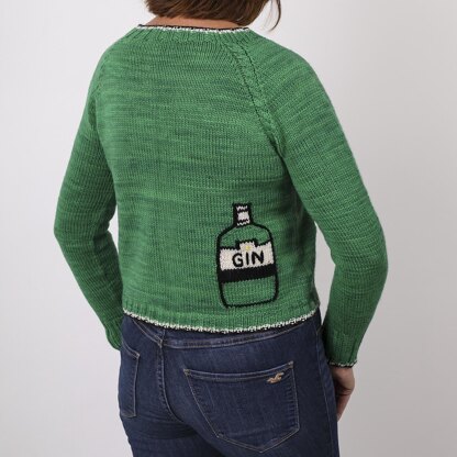 The Gin bottle and glass are worked from charts using the stranded and Intarsia techniques. The yoke is worked with raglan shaping and a cable design. Short rows are worked at the back of the neck to ensure a good fit. Embroidery is added to the Gin bottle and the glass to add detail.