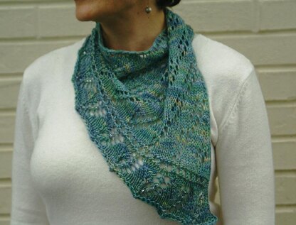 Join the ranks of the asymmetrical and confound your knitting friends.. this little scarflet is not as simple it seems. An easy lace pattern provides the basis for bias shaping, and a scalloped border adds charm. You are done in a flash.. knot up a corner and you’re on your way, or use a beautiful button closure for a different style.