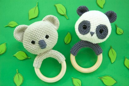 Both rattles are crocheted in continuous spiral rounds. The ears and eye patches are crocheted separately and then sewn on. The half rings on the wooden rings are crocheted in the row without making a turning chain, don't skip the first stitches of each row. You can find links to the materials, videos about how to do the invisible decrease, the mattress stitch and how to crochet in the row without a turning chain in my blog 'Roxy's Crochet'/