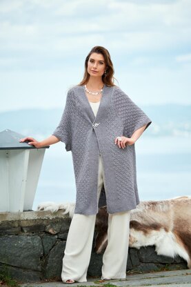 Inspired by the sculptural aestehtic of architect Hugo Kohno’s work in Tokyo, is this oversized long kimono style jacket with short wide raglan sleeves. It is adorned with a domed check pattern ending in wide moss stitch borders at the front, bottom and in the sides.