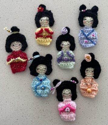 These cute little Kokeshi Dolls are flat. They could be added to a dress or cardigan or just hang from a backpack.