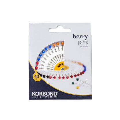 Korbond Berry Pins offer 40 large headed pins and are conveniently stored on a wheel in eight different coloured segments. With strong metal shafts to withstand the thickest of materials, they act as markers for the professional and home sewer alike.\nContents Include:\n• 40 plastic headed pins in various colours