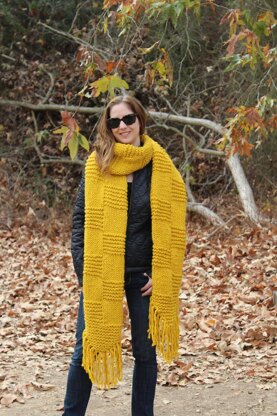 The Kravitz is fitting of its namesake and is a massive scarf for the coldest of winters or the avoidance of the most persistent of paparazzi. Knit with super bulky yarn on size 17 needles, you can knock this out in a day or two and keep yourself very warm in the process. The edges come to points and have fringe added during finishing. The main body of the scarf uses a large basket weave stitch to create a cool textured look.