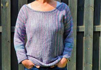 Kristina is a very, very easy to knit vertical striped sweater worked sideways in single pieces. The perfect project for knitting beginners, here shown in a pure cotton yarn. But this sweater will look great worked with a pure wool or a DK merino yarn.