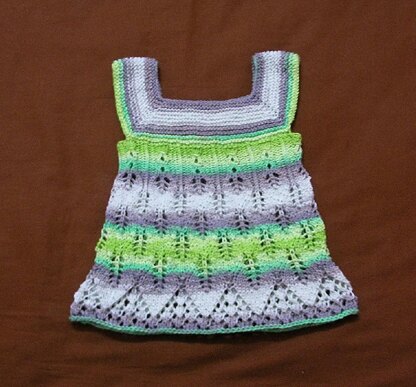 This cute little top is knitted in the round seamlessly from top down. It has garter stitch yoke and overall lace for the bodice.