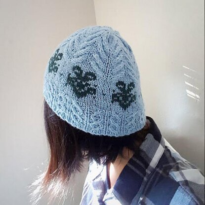 A beanie style hat knitted from bottom up, with cables and colorwork decorated around the hat.