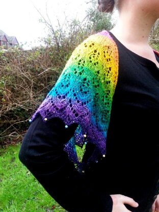 A half hexagon shape which can be worn as a shrug, shawl or a scarf. Attach buttons to the bottom of each spine, on the WS. Fold the front edges over and fasten the buttons into a yarn over, to convert from a shawl to a shrug.