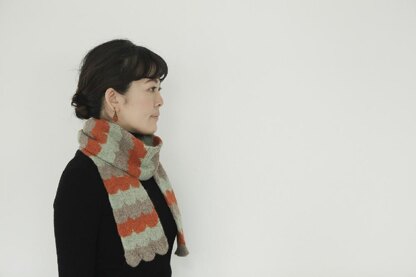 端のフワフワとした形と色味が可愛いマフラー。きれいな半円形になるよう掛目と減目のレース編みで形作り、 本体は輪で色を替えながら編み進めます。リュックの隅にくるくるっと巻いて入れておけば、肌寒い森のハイキ ングのお守りになりそう。