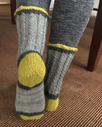 Thick socks with columns of twisted stitches create warm, and comfortable socks perfect for wearing on hardwood floors during the cooler months. The swirly twisted columns of ribbing are created without cable needles, to keep your knitting moving along.