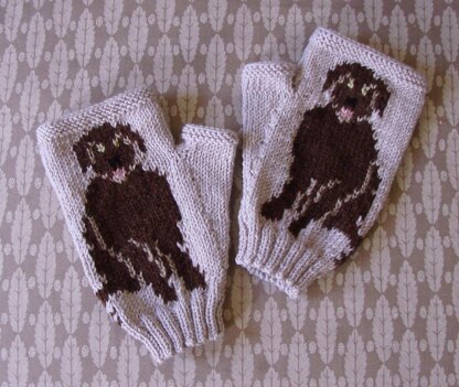 PDF pattern for a pair of Labrador Retriever fingerless mitts with a Labrador Retriever dog on the front of each. The palms of the mitts are plain.