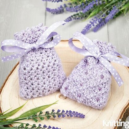 Two lavender bags patterns, one is in a simple lace stitch, the other in a knit and purl lattice stitch with beads sewn on after knitting. Both are tied with a ribbon. Photos Simply Knitting.
