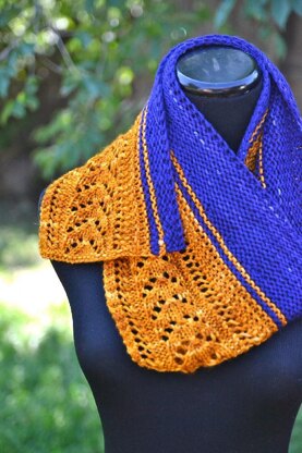 I love the look of a shawlette with a pattern stitch edge and a simple garter stitch body. In this pattern the edging is knit first in a simple lace pattern, then stitches are picked up along the edge to make the shawlette. I chose to use two colors but this could easily be made with one color.
