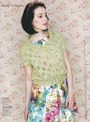This is a pattern for a Lace Blouson Cardigan, originally published in Knitting magazine. I don t have the issue number but it will be in a few months following May 2013. It is in a flower lace stitch with a smaller scale lace pattern on the borders and collar, in a tee shape with no sleeve seams. It has a tie at the waist, and 7 buttons. Photos Laurel Guilfoyle for Knitting magazine.