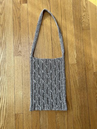 The body of the bag is knit in the round, starting in the middle of one strap. Then front and back sts are bound off, and straps placed on a stitch holder. Straps are worked and connected with 3 needle bind off, and bottom edge is joined with Kitchener stitch.