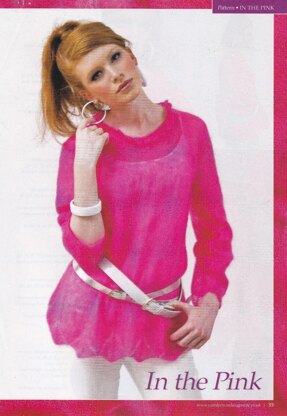 This is a pattern for Lace Edge Mohair Tunic, originally published in Yarn Forward. It is in stocking stitch with a lace edge on the hem, cuffs and a smaller one on the neck. Although this is styled in a young way for the magazine, it would suit any age group. Photos Yarn Forward.