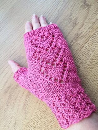These fingerless gloves are fairly easily knitted and feature a lace stacked hearts design running along the back side of both hands with a plain palm side. This pattern is for fingerless mittens in 3 sizes. The bottom rib uses an original stitch that reminds me of hearts.