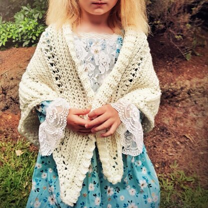 The Lace Insertion Shawl is made up of rows of ribbing, broken up by rows of lace. It is triangular in shape and may be made to any size, child to adult.