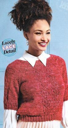 This is a pattern for lace panel top, originally published in Lets Knit. It is in stocking stitch with lace panels on the body and sleeves. Th edges are in 2 x 2 rib, and it uses a luxurious hand dyed yarn. Photos Lets Knit.