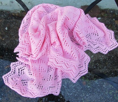 This beautiful baby’s blanket is hand knitted with Hayfield Bonus DK, in a lace triangles pattern. The acrylic content in this yarn makes this blanket soft, warm and machine washable which is perfect for babies with busy mums. The pattern is fairly easy and is laid out with fully explained abbreviations, written instructions and graphs. It would be suited to a beginner looking to move on to intermediate rated patterns.