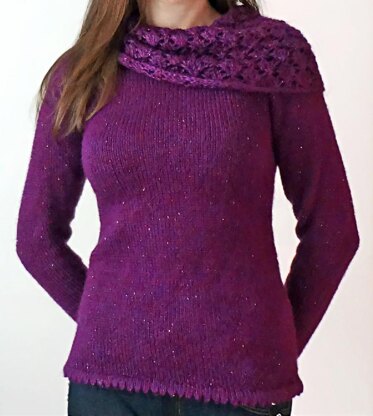 The lacy collar is knit on progressively larger circular needles to preserve the lace pattern and give a nice widening cowl neck.