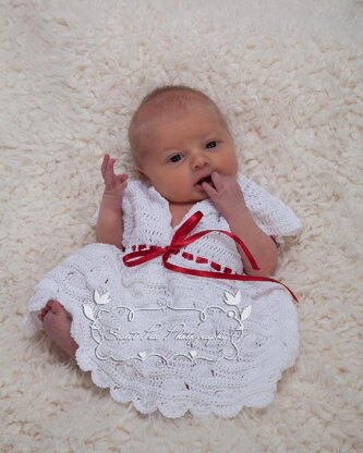This textured dress (suitable for age 0-6 months) has a delightful ripple and fan pattern (waves and shells) and is worked from the neck down in one piece.