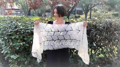 This is a pattern for a crochet lacy scarf or shawl, made with super fine (category 1), mohair and silk blend yarn (70% super kid mohair, 30% silk) and a size H (5 MM) hook. The finished measurements are about 60 inches long and 17 inches wide (about 690 yards of yarn are needed).