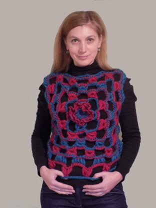To create this top I used 4 skeins of Katia Love Wool (2 skeins of color 116 fuchsia + 2 skeins of color 118 turquoise). To create the lacy effect I alternated broomstick and empty squares. The central squares are crocheted in the round in this technique that I called Broomstick Granny Square. You can use only one color, if you prefer. The 2 pieces are assembled seamlessly. Some additional rows are added at the bottom: I played with loops to create other effects than broomstick for finishing.