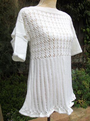 This design is very flattering, nothing clingy in the lower section and contrasting with the deep yoke. The lower edge has a ruffle effect finished off with a mass decrease row before working the tiny eyelet border. The ladder stitch section is in stocking stitch with ladders being formed by “yarn forwards” at the start, and ending with those same made stitches being dropped off the needle and run down to the “yarn forwards”. Easy! The yoke has an eyelet grid pattern and is simple to work. The upper edge is finished off with garter stitch, including the shoulder shaping. The sleeves are mainly in stocking stitch with two equal slits on each side which are edged in garter stitch.