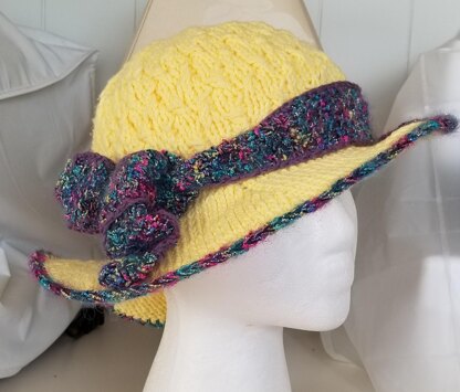 I think many ladies enjoy sporting a fashionable wide brimmed hat, especially with an eye catching hat band! In this pattern, you knit your own wired ribbon hat band, using the yarn of your choice and 28 gauge jewelry wire.