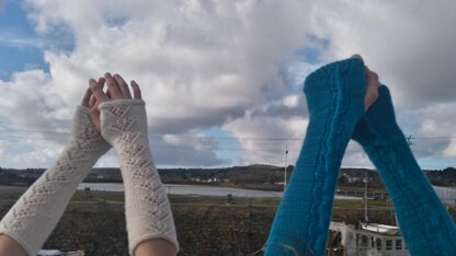 Knitting pattern for two pairs of ladies long fingerless mittens/gloves.