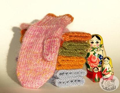 Yarn suggested: Aran (8 ply). The pattern looks with heavily variegated yarns, tweed yarns and handspun very well. You can knit the mittens with two threads of Light Fingering yarn.